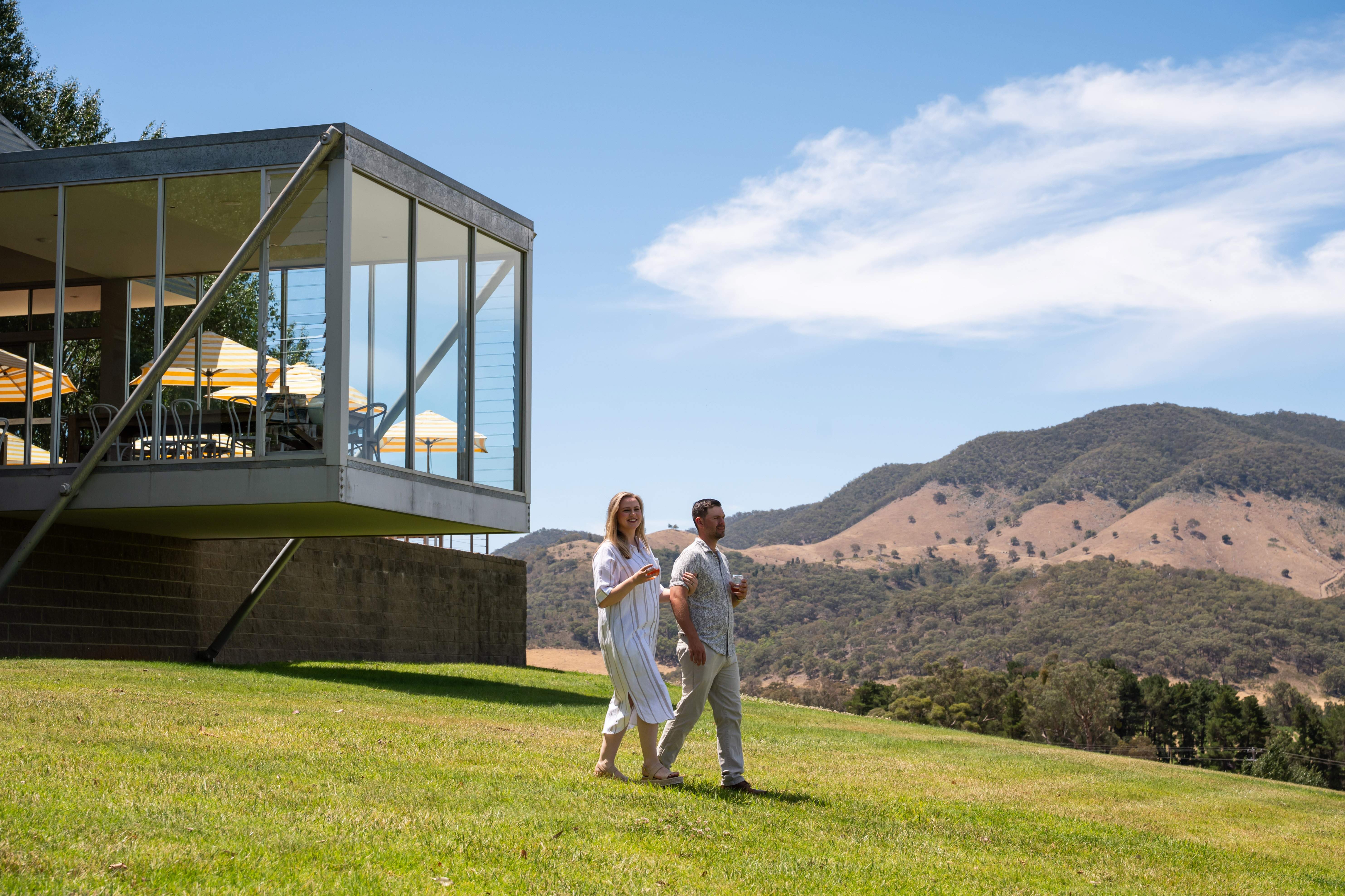 From the stunning glass-walled cellar door, look out over the dam to the hills of Mudgee wine country.